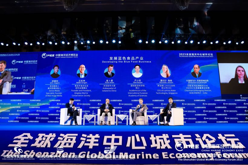 “发展蓝色食品产业”全体会议由资深媒体人、真实影像创始人邱嘉秋主持,国际欧亚科学院院士严小军,冰岛驻华大使易卜雷,新加坡Luminis水科技公司CEO蕾切尔·詹森,青岛市海洋生态研究会理事长王松林,印度海洋能源集团SEA6 ENERGY主席兼董事总经理什里库马尔·苏里亚纳拉扬为发言嘉宾。
