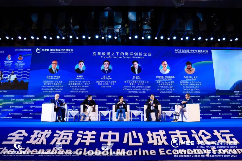 “变革浪潮之下的海洋创新企业”全体会议由深圳全球海洋中心城市建设促进会高级顾问克劳德·萨马加主持,震兑工业智能科技有限公司董事长、总经理邱伯华,美国电气与电子工程师协会会士温江涛,新加坡Motion Ventures投资基金创始人、合伙人韩曜阳,香港机器人公司Clearbot联合创始人兼首席技术官乌特卡什·戈尔,希腊The Signal集团技术风险副总裁尼古拉斯·皮吉奥蒂斯为发言嘉宾。