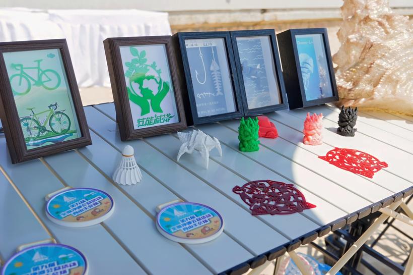 图为舟山用回收塑料瓶3D打印的奖牌及文创作品