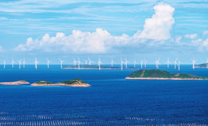 当前,我国海上风电产业规模居世界首位,为我国海洋经济发展不断开创新局面提供绿色动力。图为2025年7月6日,浙江省台州市三门湾海域,海上风电机组迎风旋转,源源不断输送绿色能源。 人民图片 林利军/摄